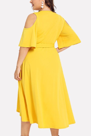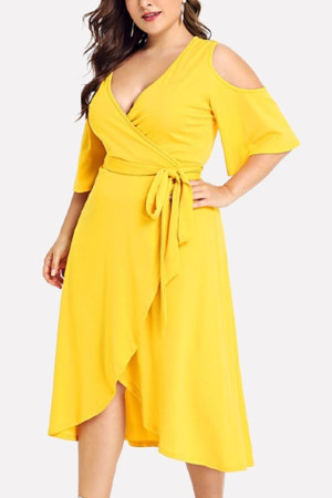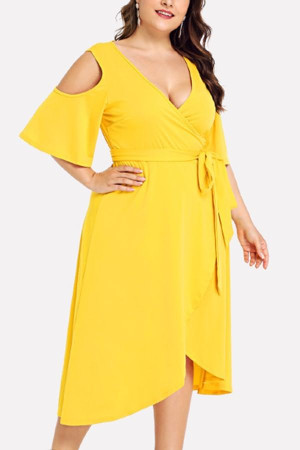 Sunny Summer Vibes: Yellow V-Neck Wrap Cold Shoulder Tied Plus Size Overlap Dress