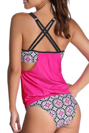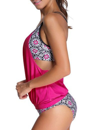 This is a tankini swimsuit made of polyester with a print pattern and wire free, padded support. It comes with one top and one panty, without accessories. It is available in sizes XS-5XL, with corresponding US sizes 0-34 and bust, waist, and hip measurements.