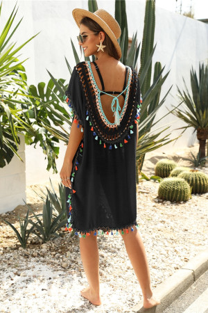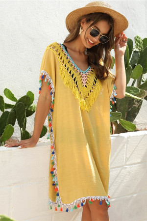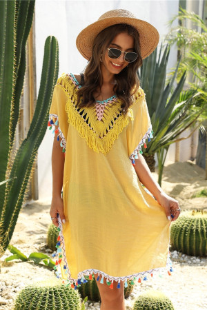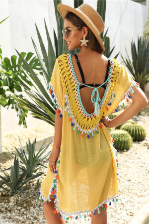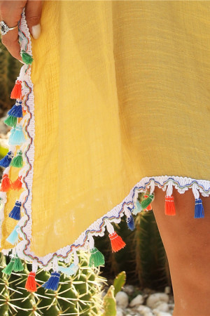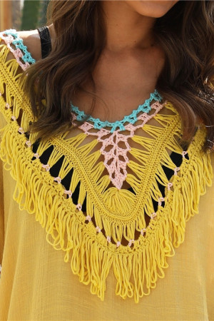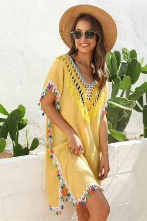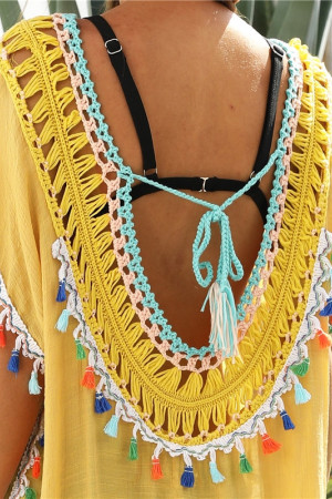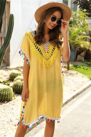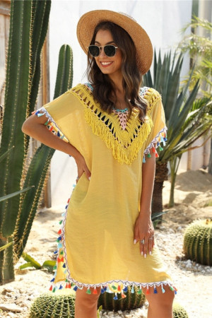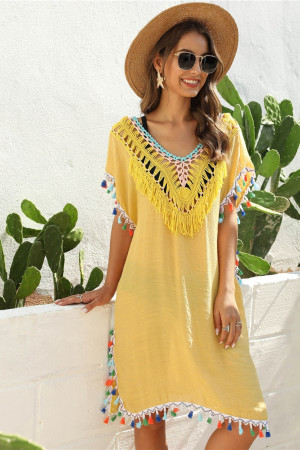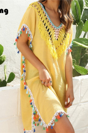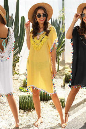 Summery White & Black Chiffon Tassel Beach Dress with Fringe Up Yellow Beachwear Cover Up