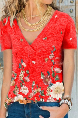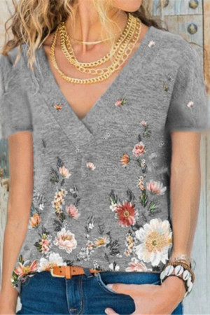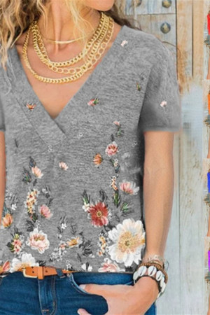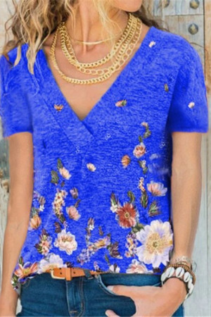 This casual summer shirt is made of polyester and features a floral pattern. It has a V-neck, short sleeves, and a regular length. It is thin, made of broadcloth, and has a loose fit. No decorations are included.