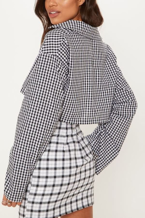 This stylish crop top features a black-and-white plaid pattern, long sleeves, and a lapel collar. It is perfect for a casual or dressy look and is sure to make a statement.
