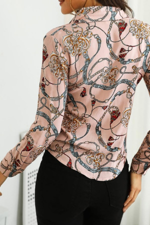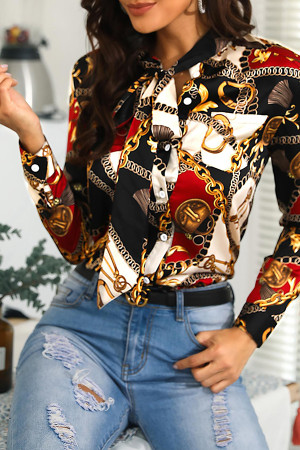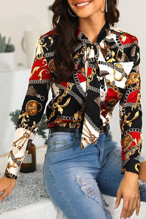 This streetwear style features a regular length, full-sleeved, turn-down collar shirt made of a combination of cotton and polyester fabrics with a chiffon fabric type. The shirt is decorated with a bow and has a print pattern.