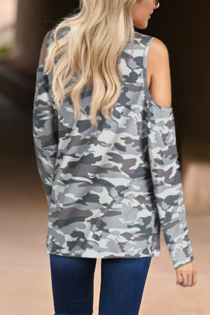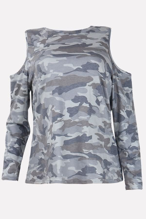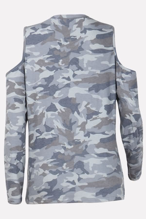 Gray Camo Cold Shoulder: The Perfect Casual Long Sleeve T-Shirt