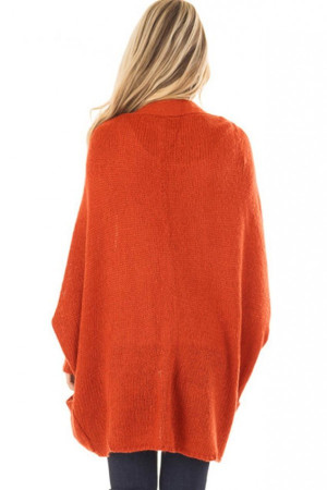 This sweater cardigan features orange knitted pockets, bat sleeves, and an open front. It is a stylish and comfortable piece that can be worn for a variety of occasions.