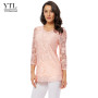 Women's Plus Size Vintage Floral Lace Blouse with Three Quarter Sleeves and Round Neck - Pink