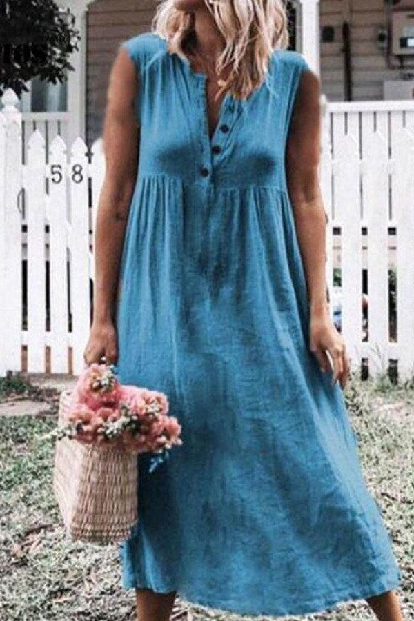 This summer casual pleated dress is made of linen and cotton, featuring a solid pattern, a V-neck neckline, regular sleeve style, natural waistline, and a sleeveless design with buttons as decoration.