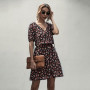 This summer dress features a prairie chic young style with an A-line silhouette, bow neckline, short regular sleeves, empire waistline, and a floral pattern. It is made of a cotton and polyester blend and has no decoration.