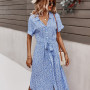 Floral Vibes: Casual V-Neck Mid-Length Short Sleeve Button Loose Lace-Up Dress for the Holiday...