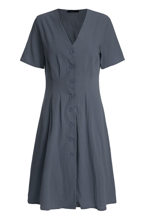 This casual summer dress is made of cotton and has a loose silhouette. It features a V-neck, tank style sleeveless design, buttons for decoration, and a natural waistline. The pattern is solid.