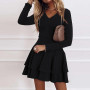 Elegant Autumn Office Mini Dress - Neck Pleated Party Spring Solid Casual Long Sleeve Loose