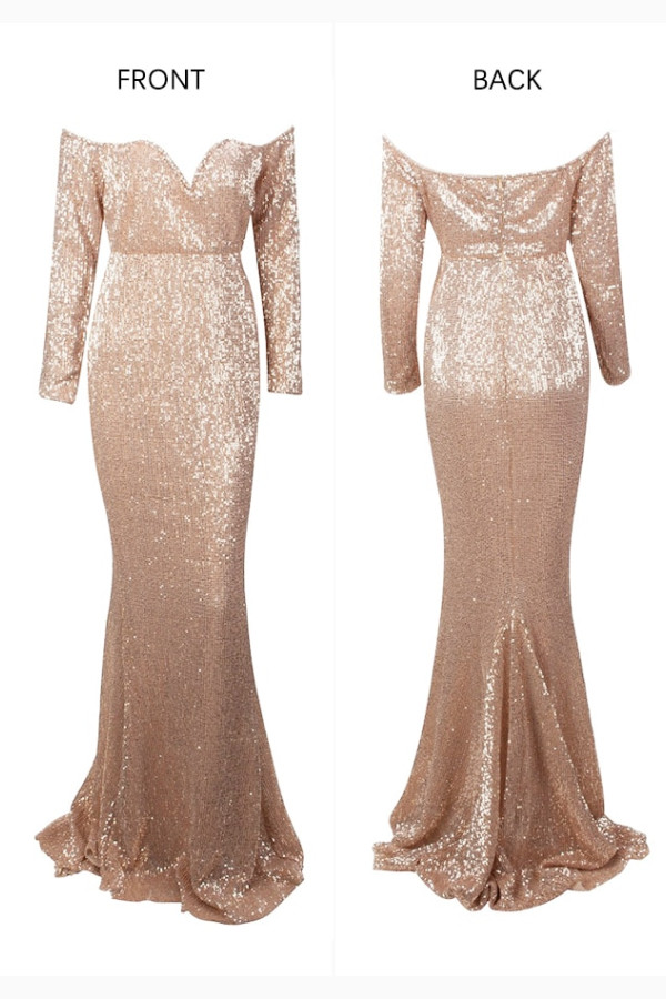 Glamorous Plus Size Rose Gold Deep V-Neck Off-the-Shoulder Bodycon Elastic Sequins Maxi Dress