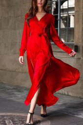 Red Wrap-Around: V-Neck Tie-Waist Maxi...