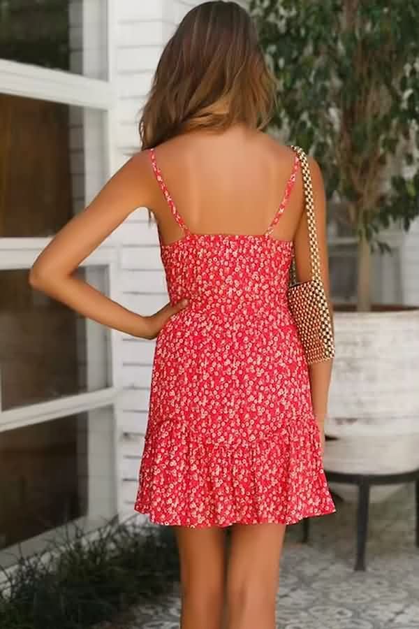 This casual dress features a red floral pattern and spaghetti straps. It has a button up front and is perfect for any casual occasion.