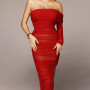 Red Hot One-Sleeve Ruched Mesh Slit Bodycon Party Dress