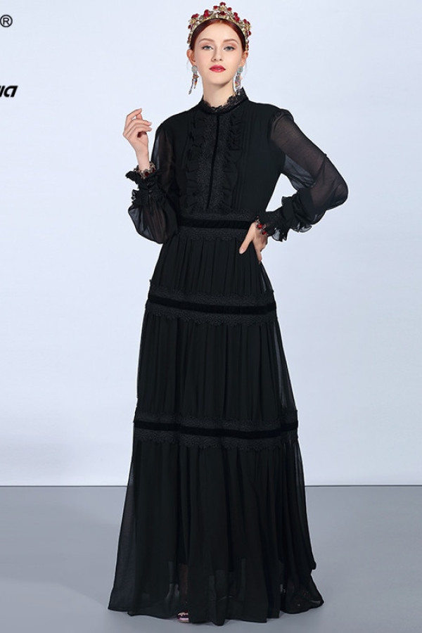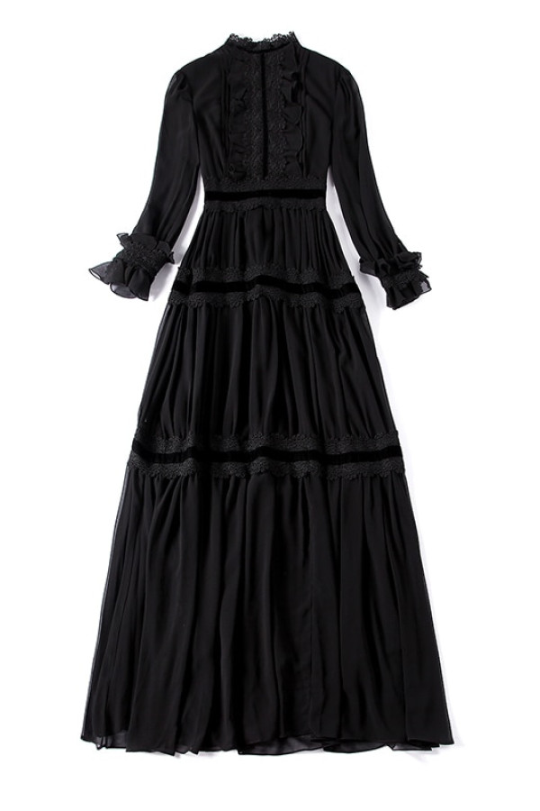 Vintage Elegance: Black Lace Patchwork Maxi Dress with Long Sleeves and Ruffles