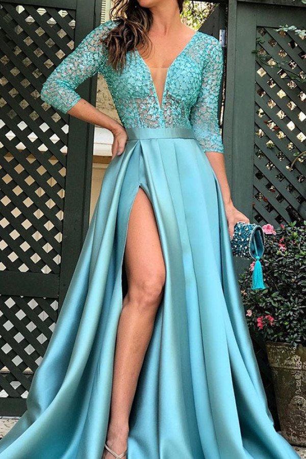 This formal dress is perfect for the spring and autumn seasons. It is made of polyester and has a fit and flare silhouette. The neckline is a V-neck and the sleeve length is three quarter with a regular sleeve style. There is no decoration and the waistline is natural. The pattern type is patchwork.