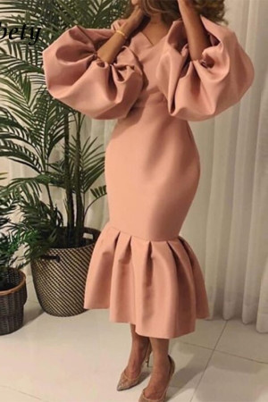 Spring-Ready Elegance: Vintage Puff Long Sleeve Ruffle Vneck Solid Bodycon Mermaid Dress for...