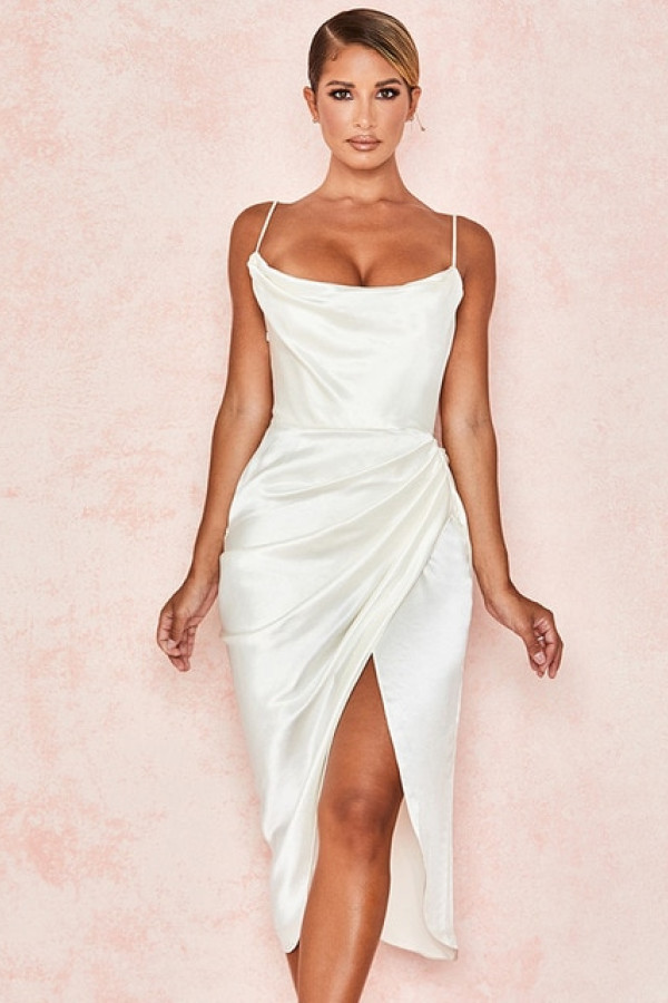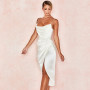 Autumn Winter Elegance: Solid Stain Strap Midi Dress with High Slit and Ruched Bodycon for...