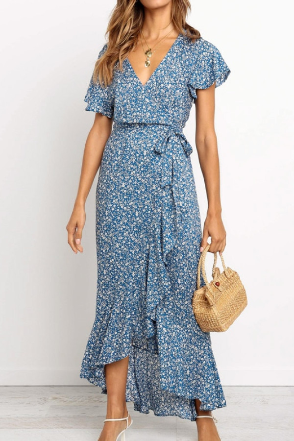 This dress is made of chiffon and polyester, with a V-neck, short sleeves, empire waistline, and a fit and flare silhouette. It features a floral print, ruffles, petal sleeves, and a side split, making it perfect for bohemian, beach, casual, elegant, and party styles. It is a summer dress, suitable for beach occasions.