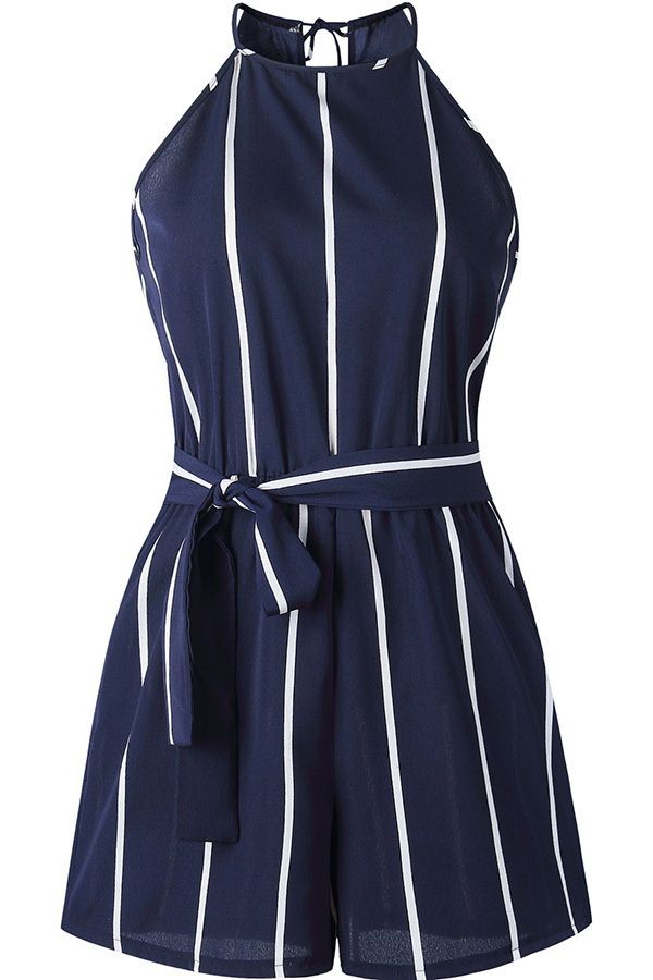 The High-Neck Striped Romper is a stylish and comfortable one-piece outfit for women. Made of polyester blended fabric, this sleeveless romper features a high neckline with a tie closure and an adjustable strap. Perfect for a casual summer occasion, it includes a belt and has a wide-leg style for a flattering fit. Easy to care for, machine washable, this romper is a must-have addition to any woman's wardrobe.