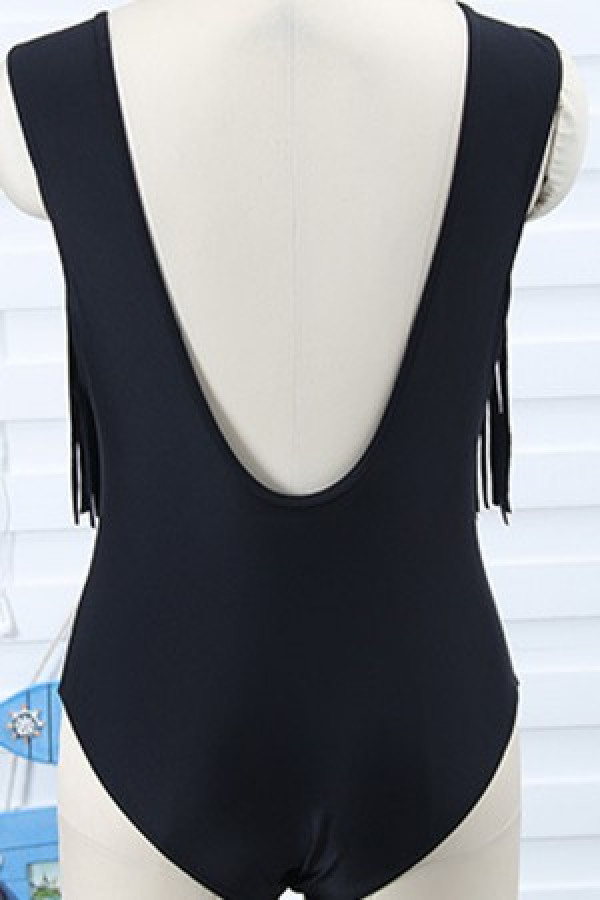 Elegant Black Plunging V Neck Fringed One Piece Swimsuit