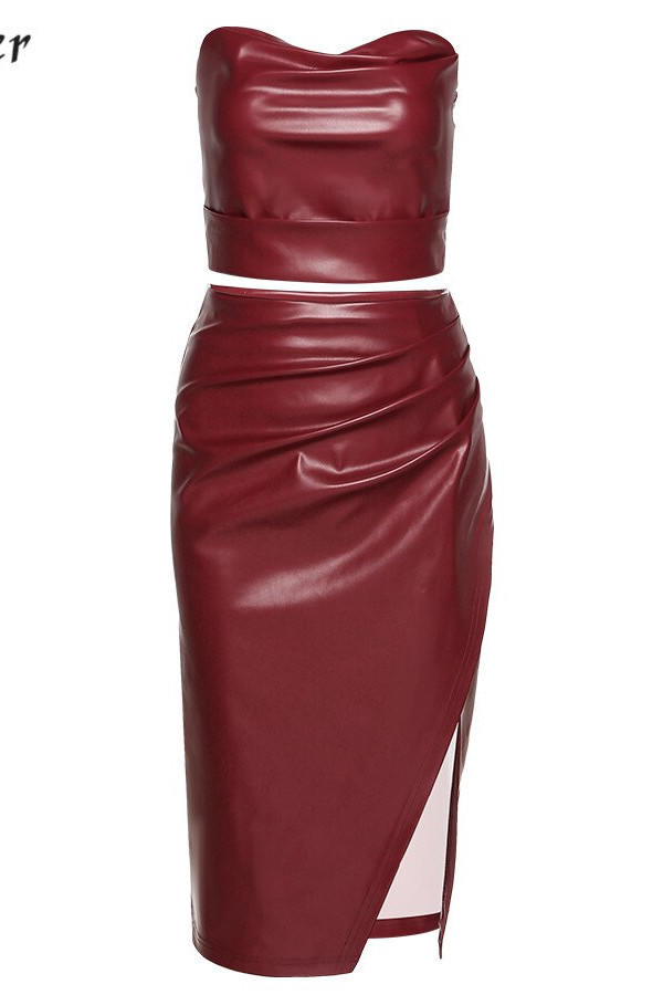 Leather Two Piece Set Tube Tank Top & Fork Design Skirt